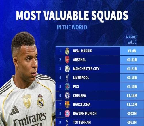 德转球队身价榜:皇马14亿欧居首,阿森纳第二曼城第三