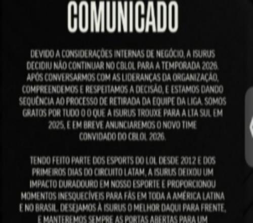 电竞体育12月5报道 巴西赛区官宣:拉美队伍ISG离开CBLOL,将寻找新赛区加入。...