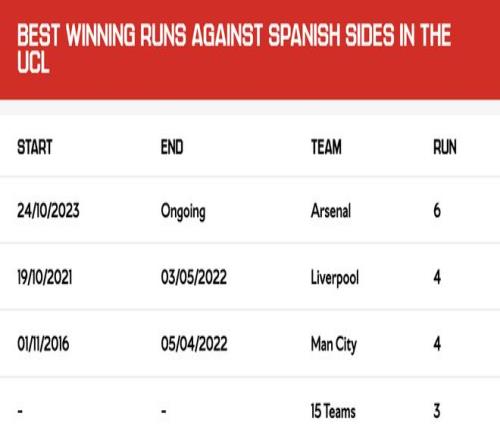 而他们完全有可能继续扩大这一战果。在阿森纳之前,利物浦和曼城曾先后做到连续4次击败西甲球队。另有15支球队对西甲球队保持3连胜的记录。
