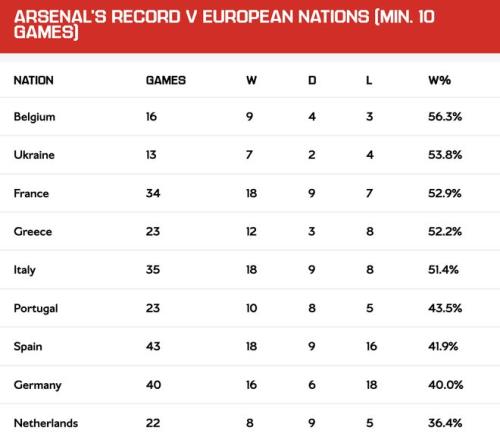 雷速体育10月20报道 阿森纳俱乐部官网晒出的数据显示,过去6次面对西甲球队,阿森纳保持全胜,面对西班牙联赛球队胜率为41.9%。